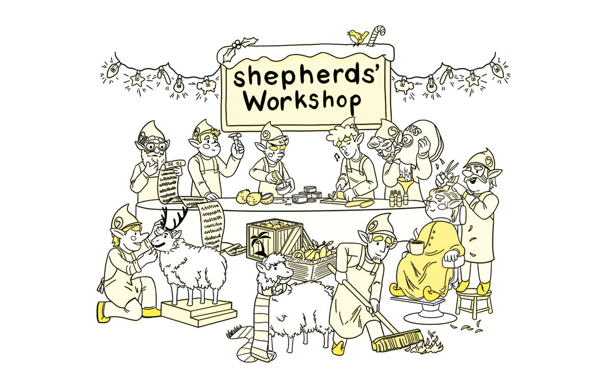 With Christmas coming up, the client requested a festive-themed advert for the salon window. Using the same illustrative style as the earlier decals, a ‘Santa’s Workshop’ concept was developed, with the elves preparing Shepherds products in time for Christmas. A sheep also featured in a whimsical reference to the salon’s name.